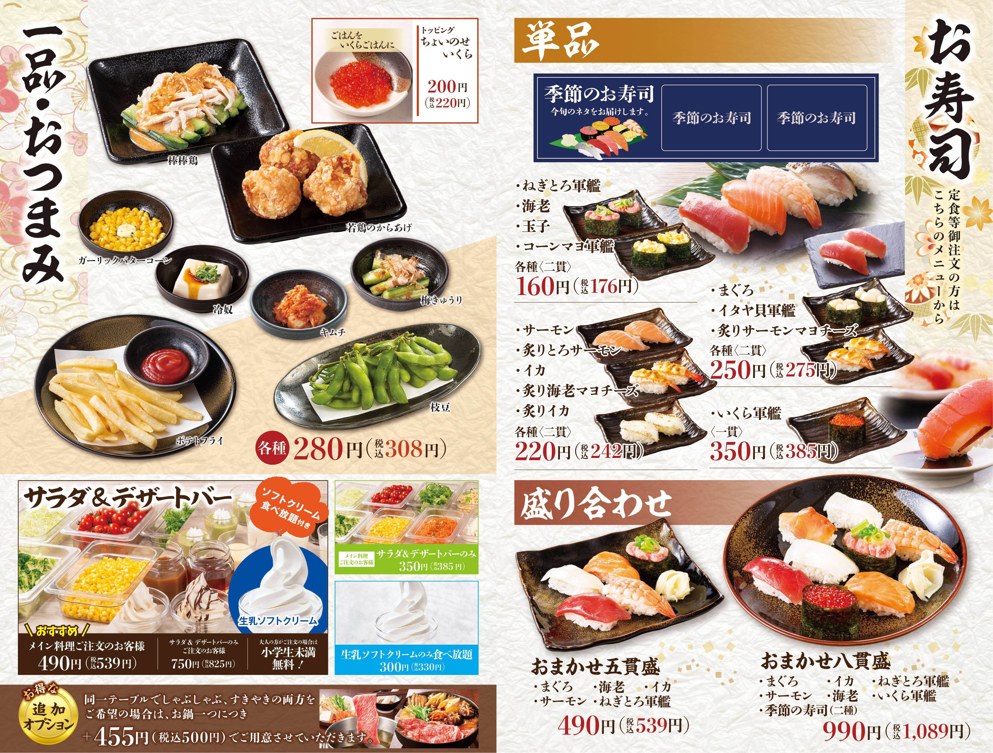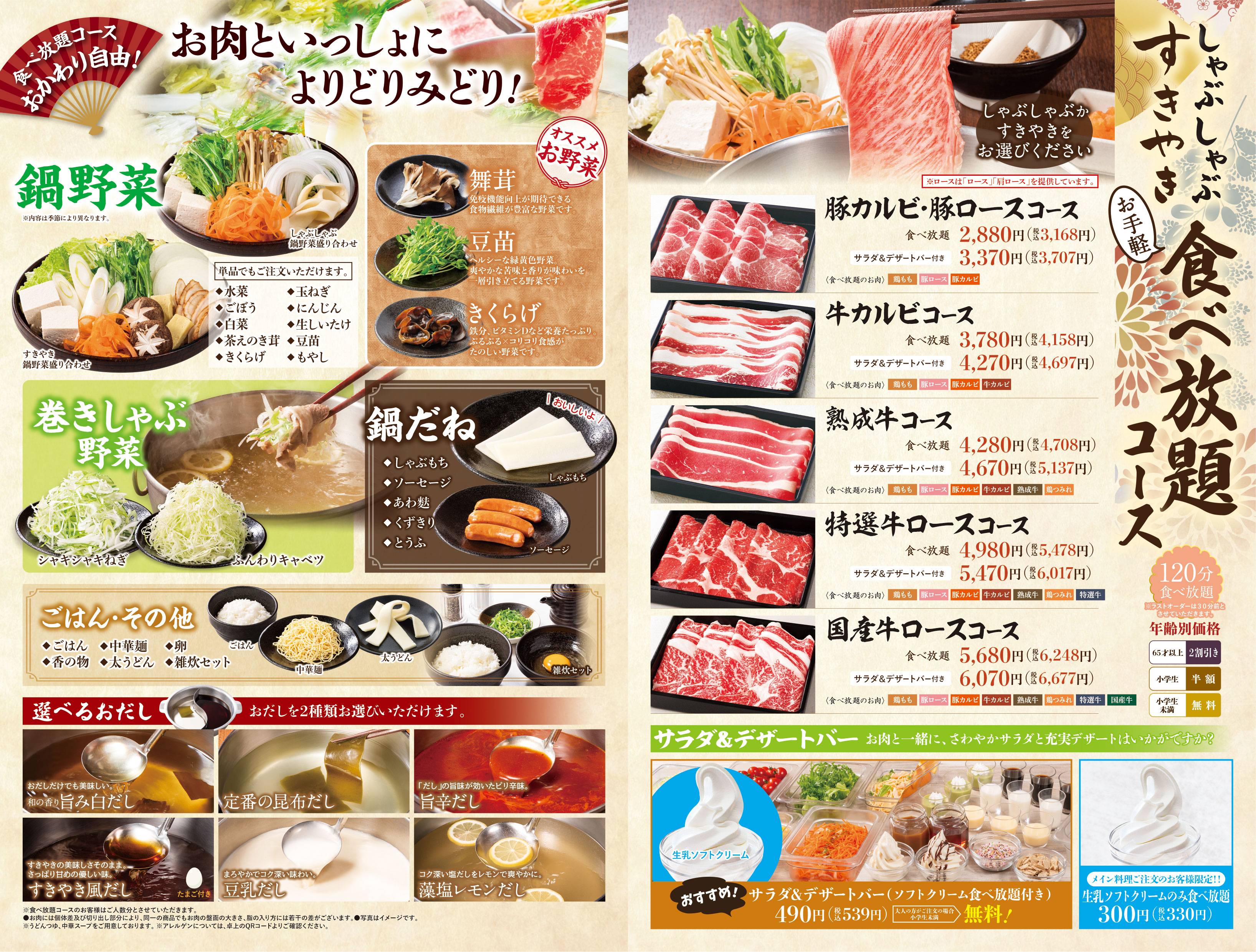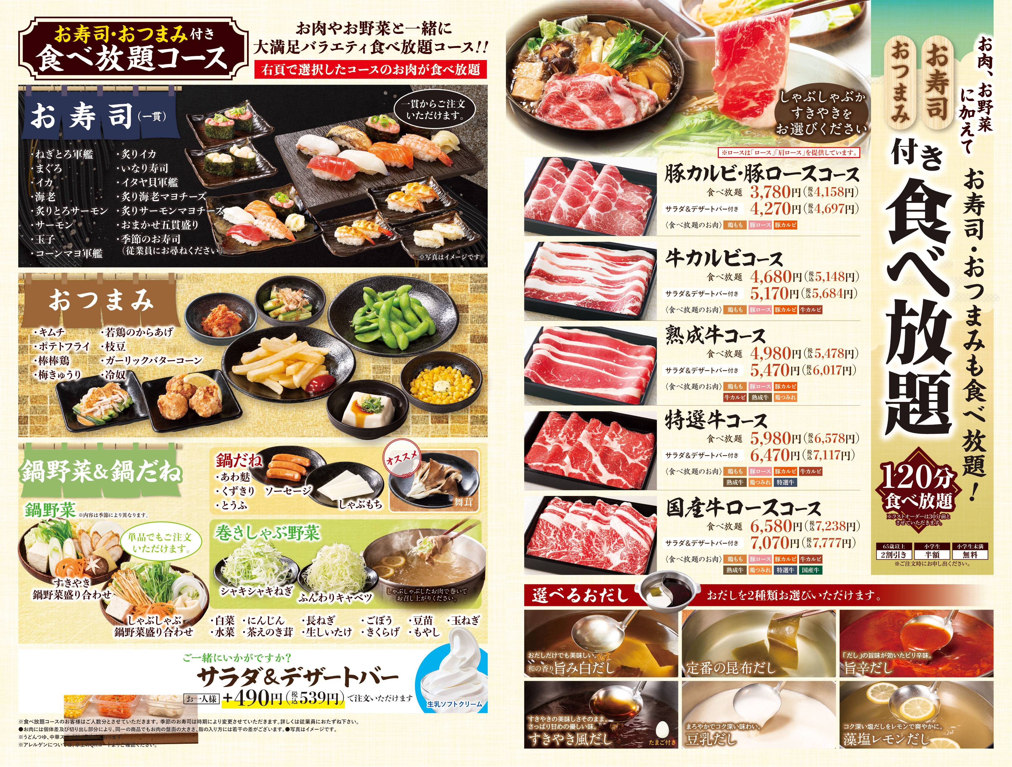 ※「しゃぶしゃぶ」か「すきやき」をお選びください。 ※食べ放題コースの制限時間は120分。※ラストオーダーは30分前とさせていただきます。 ※詳しいアレルゲン情報は、各商品の詳細をご確認ください。 ※22時以降にご注文のお客様には、深夜料金として10%のサービス料金を加算させていただきます。