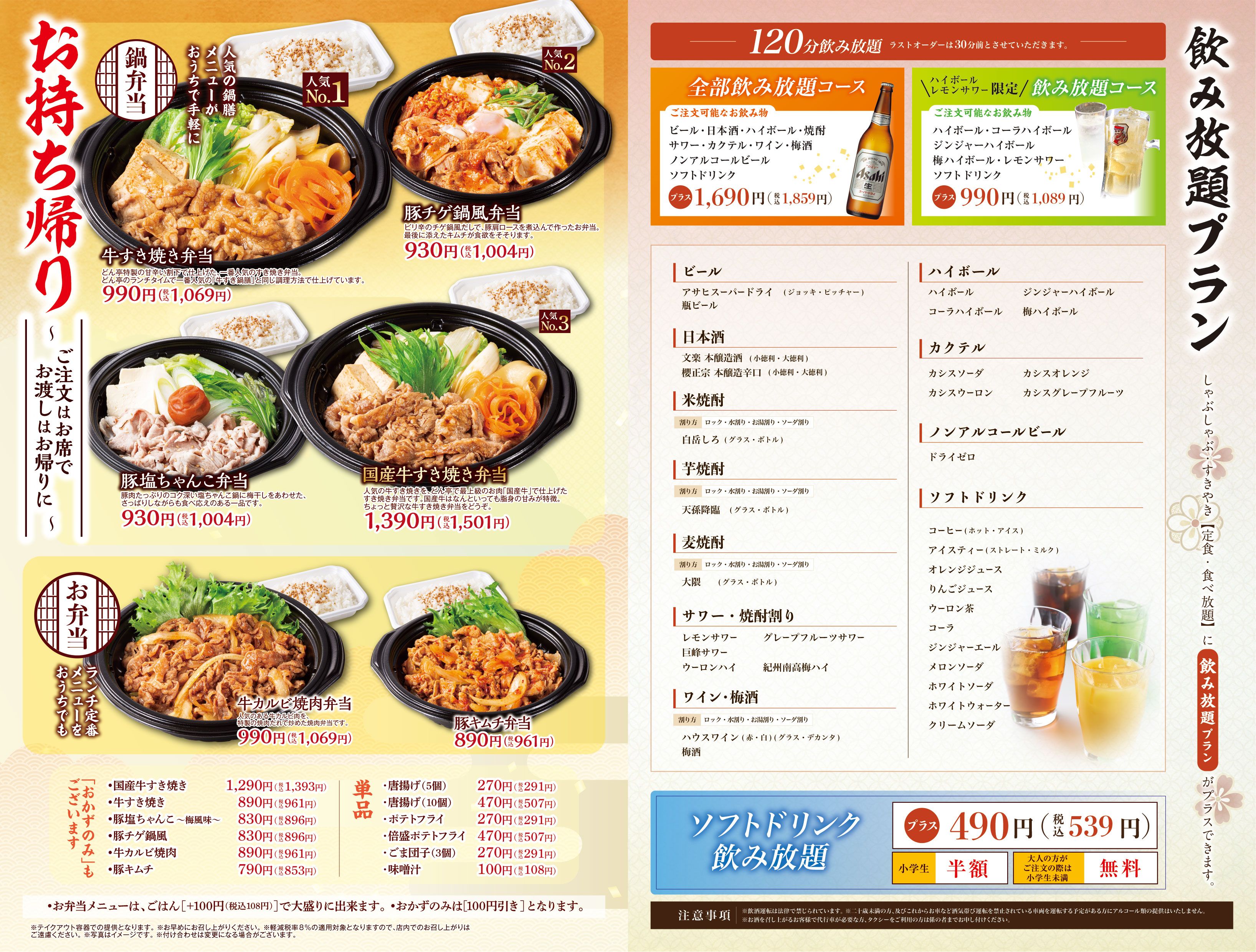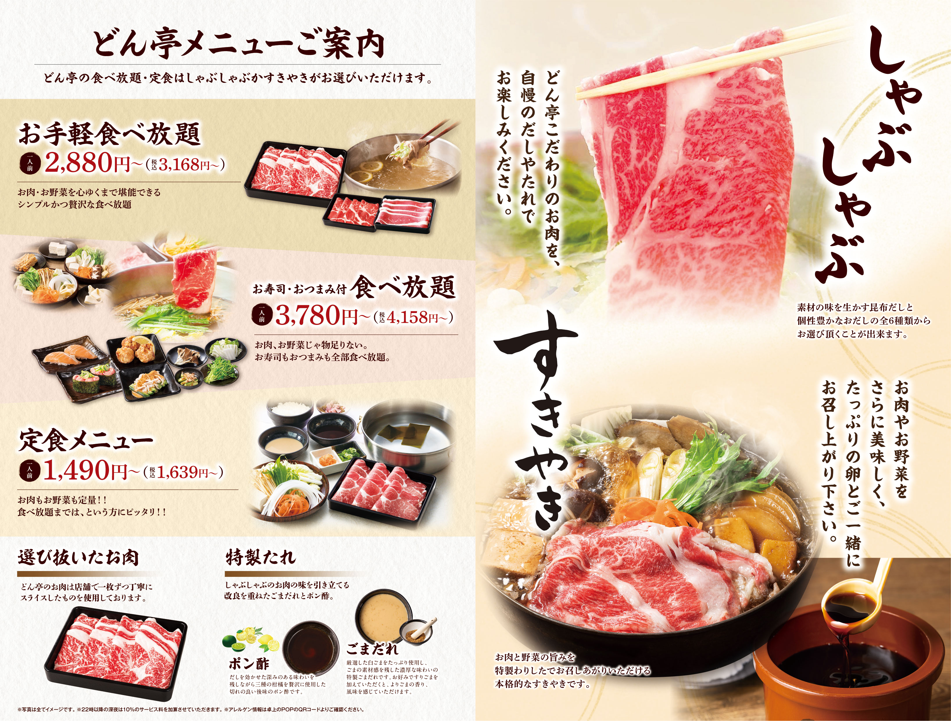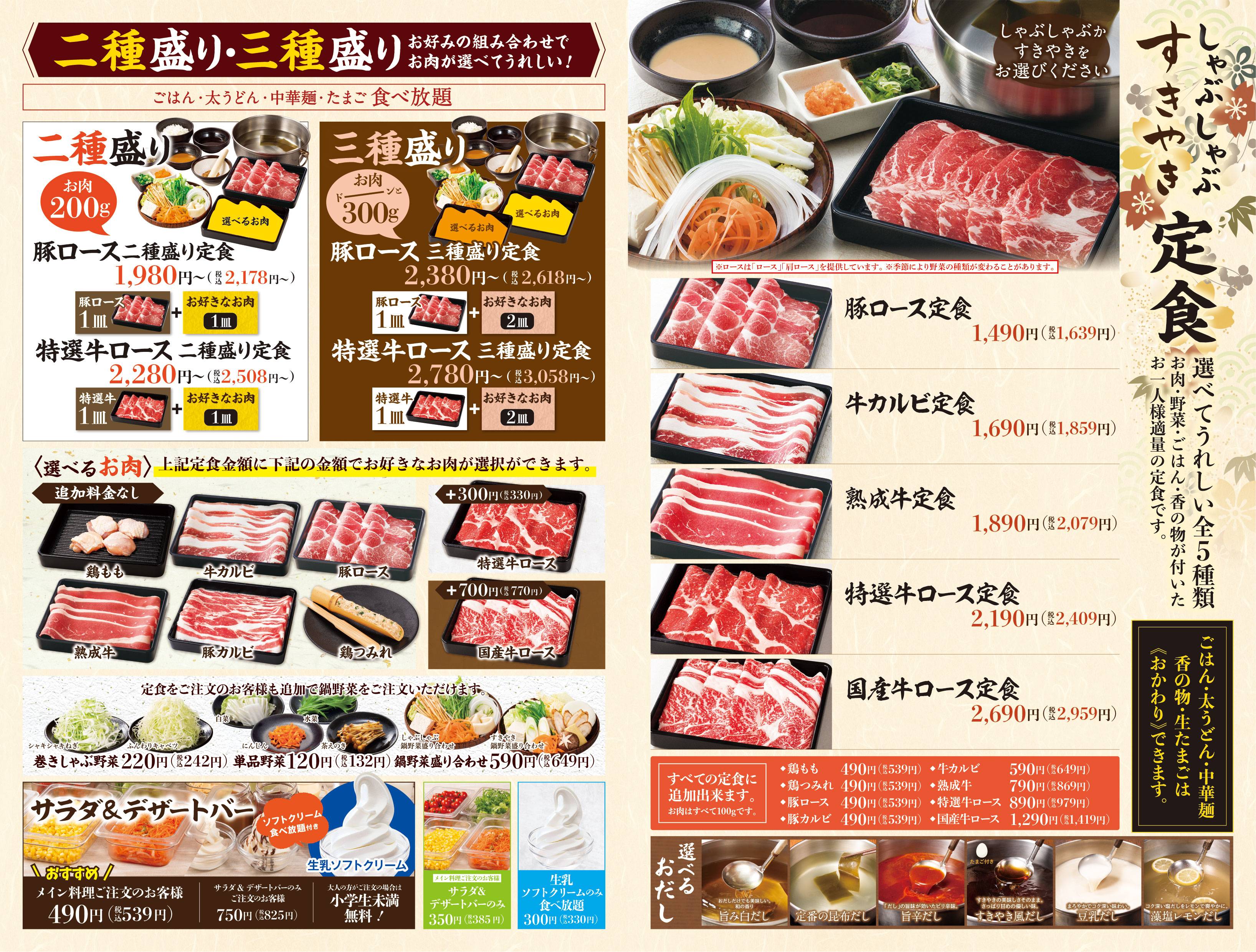 ※「しゃぶしゃぶ」か「すきやき」をお選びください。 ※食べ放題コースの制限時間は120分。※ラストオーダーは30分前とさせていただきます。 ※詳しいアレルゲン情報は、各商品の詳細をご確認ください。 ※22時以降にご注文のお客様には、深夜料金として10%のサービス料金を加算させていただきます。
