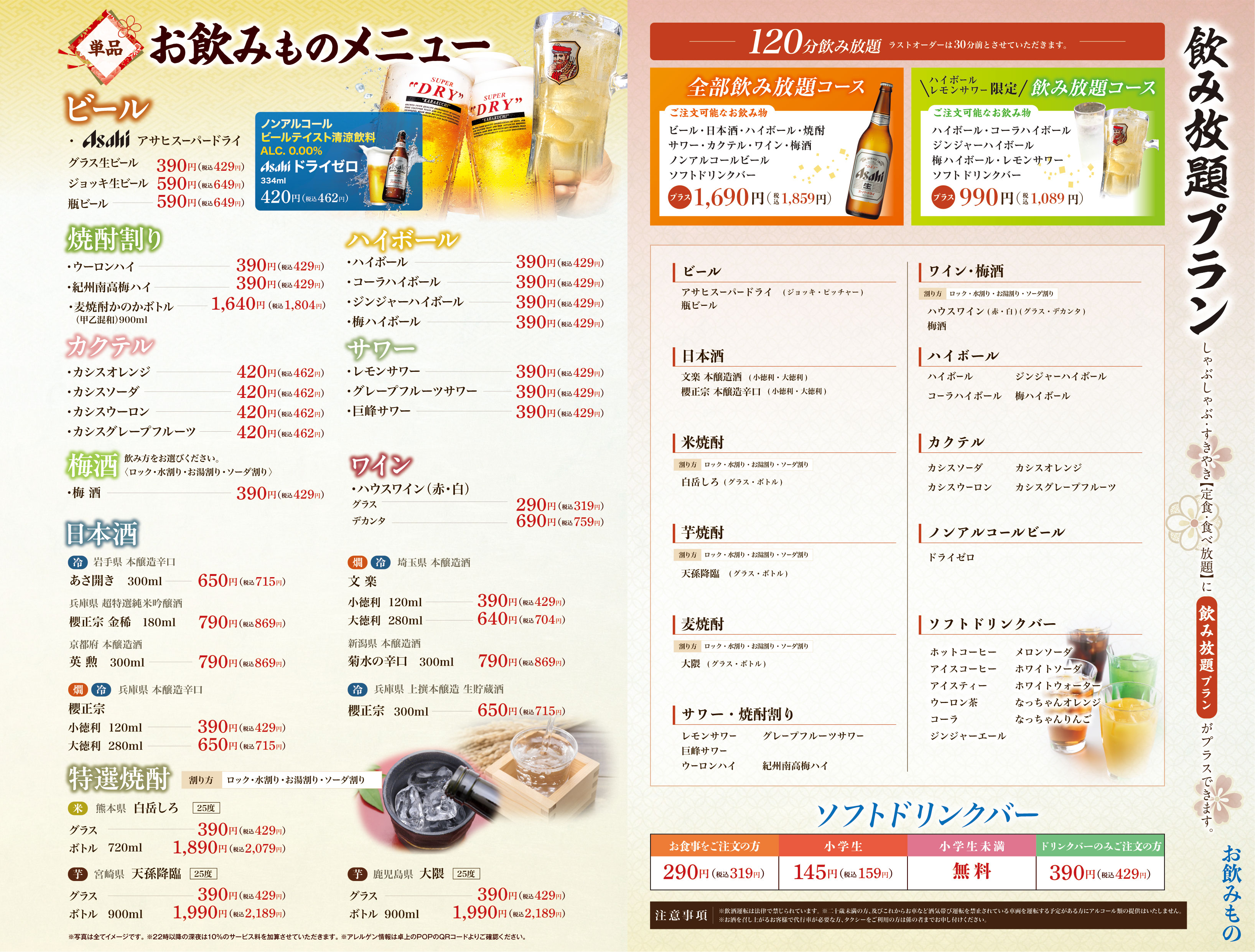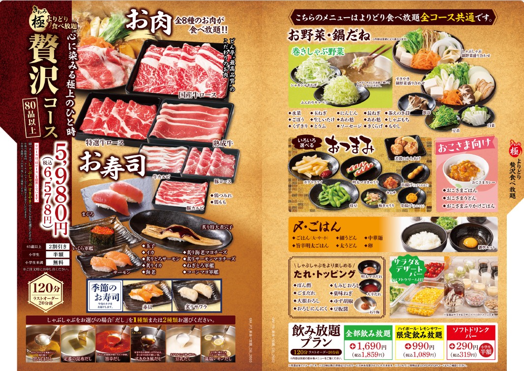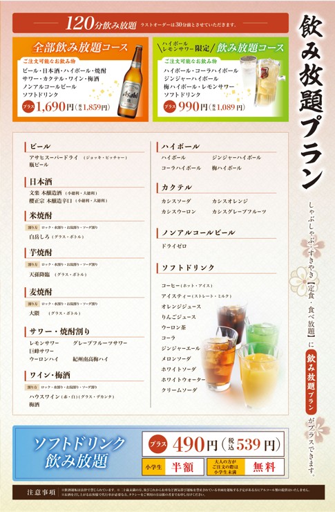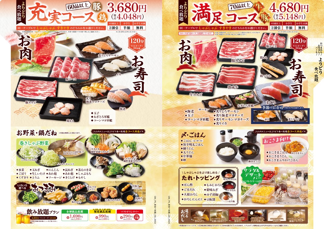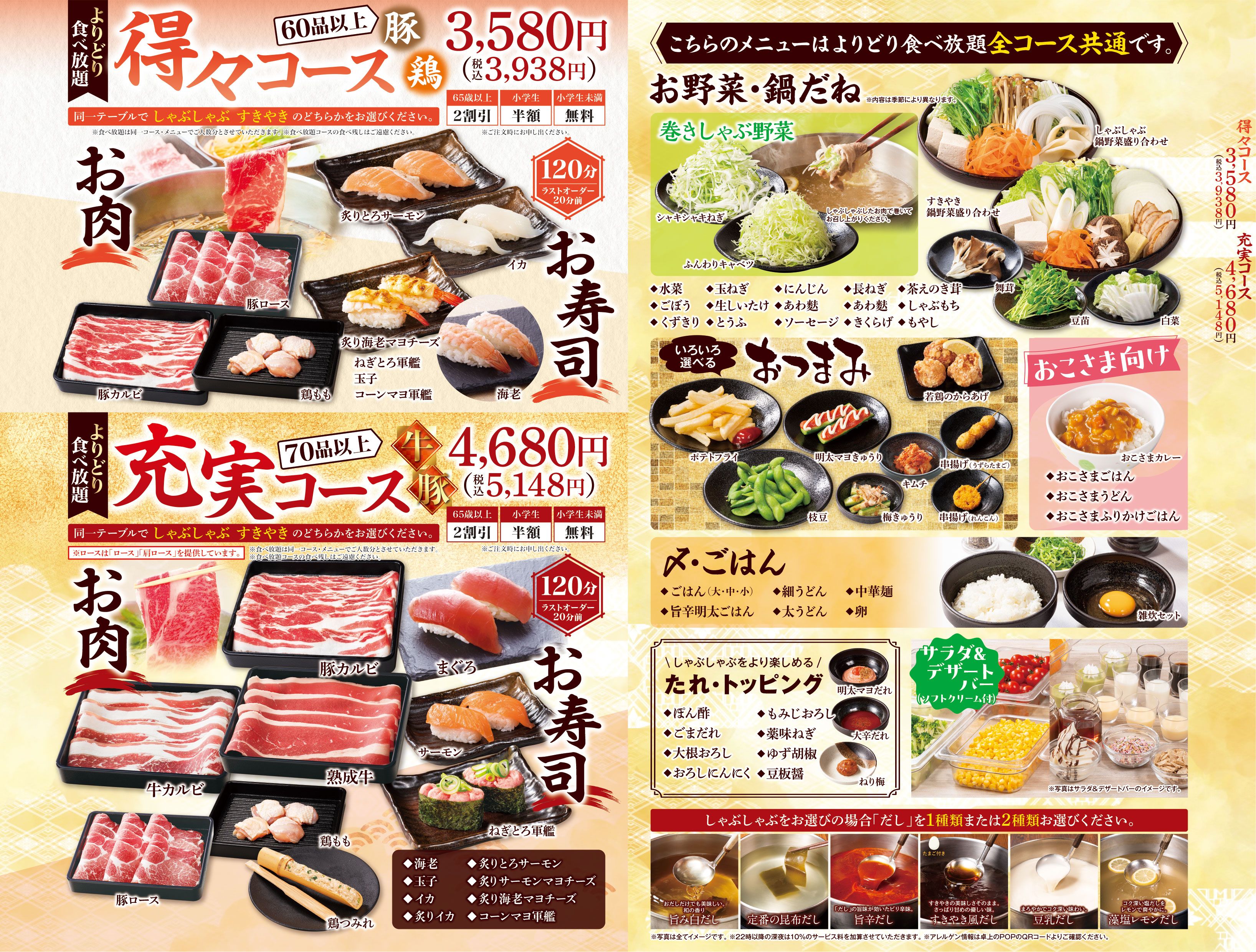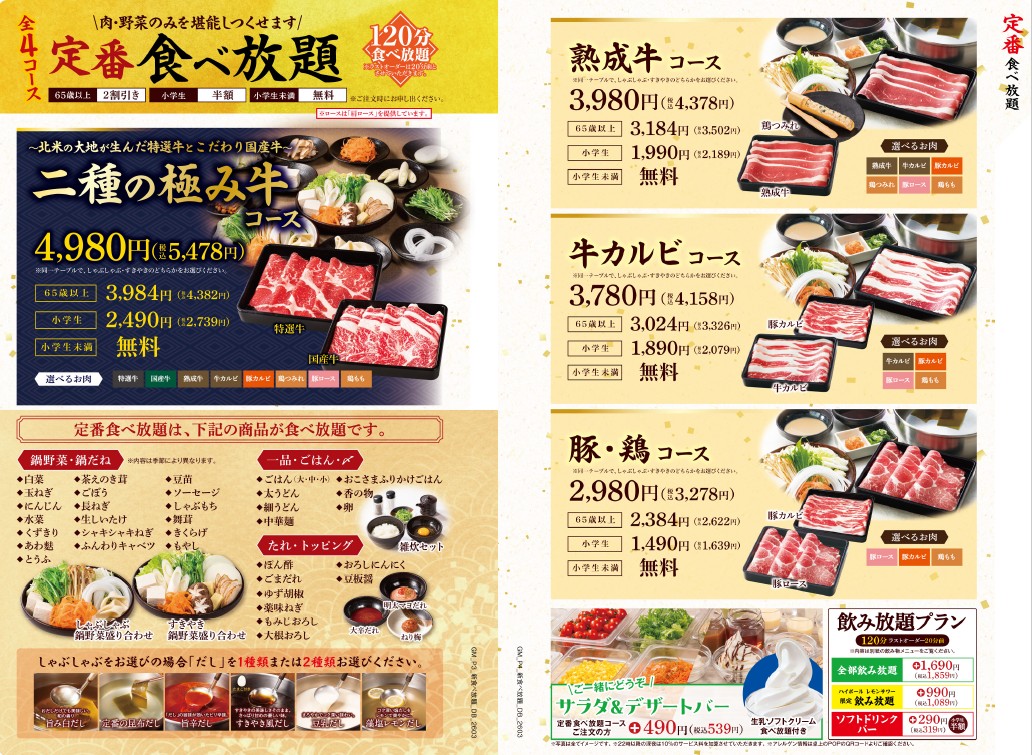 ※「しゃぶしゃぶ」か「すきやき」をお選びください。 ※食べ放題コースの制限時間は120分。※ラストオーダーは30分前とさせていただきます。 ※詳しいアレルゲン情報は、各商品の詳細をご確認ください。 ※22時以降にご注文のお客様には、深夜料金として10%のサービス料金を加算させていただきます。