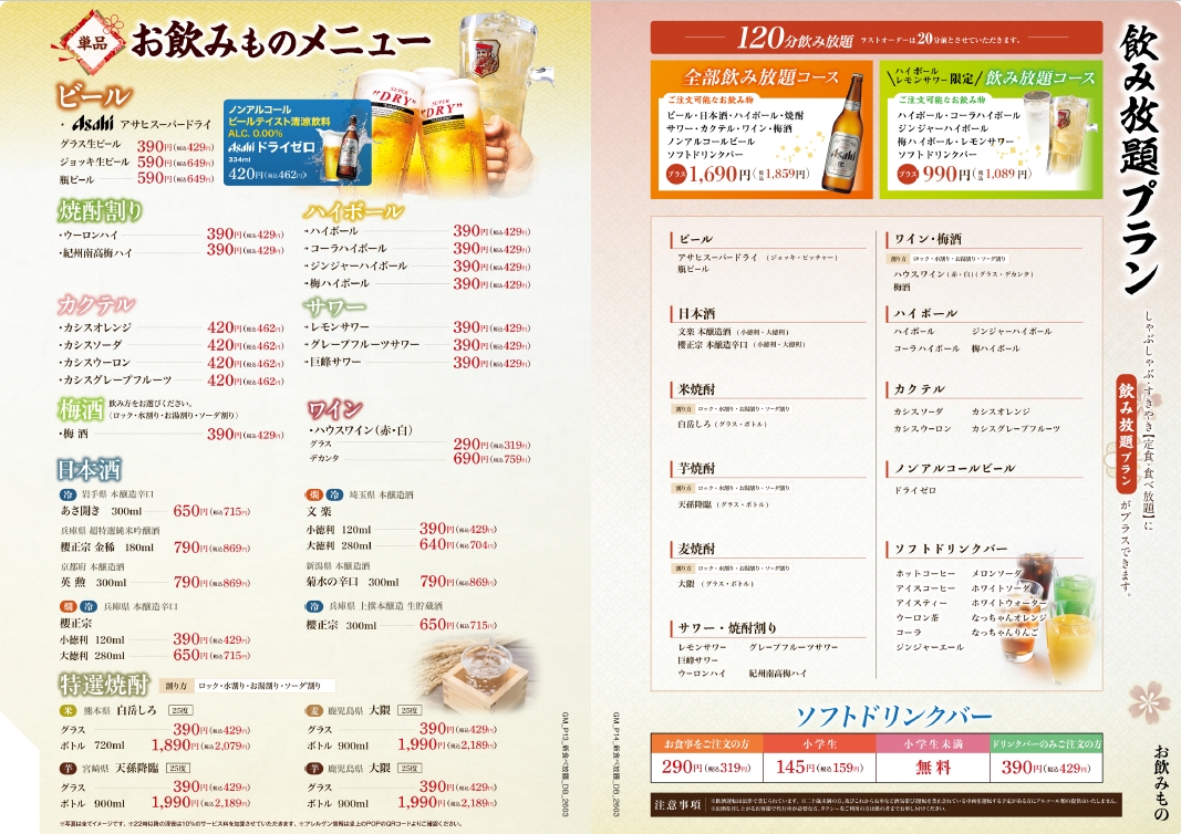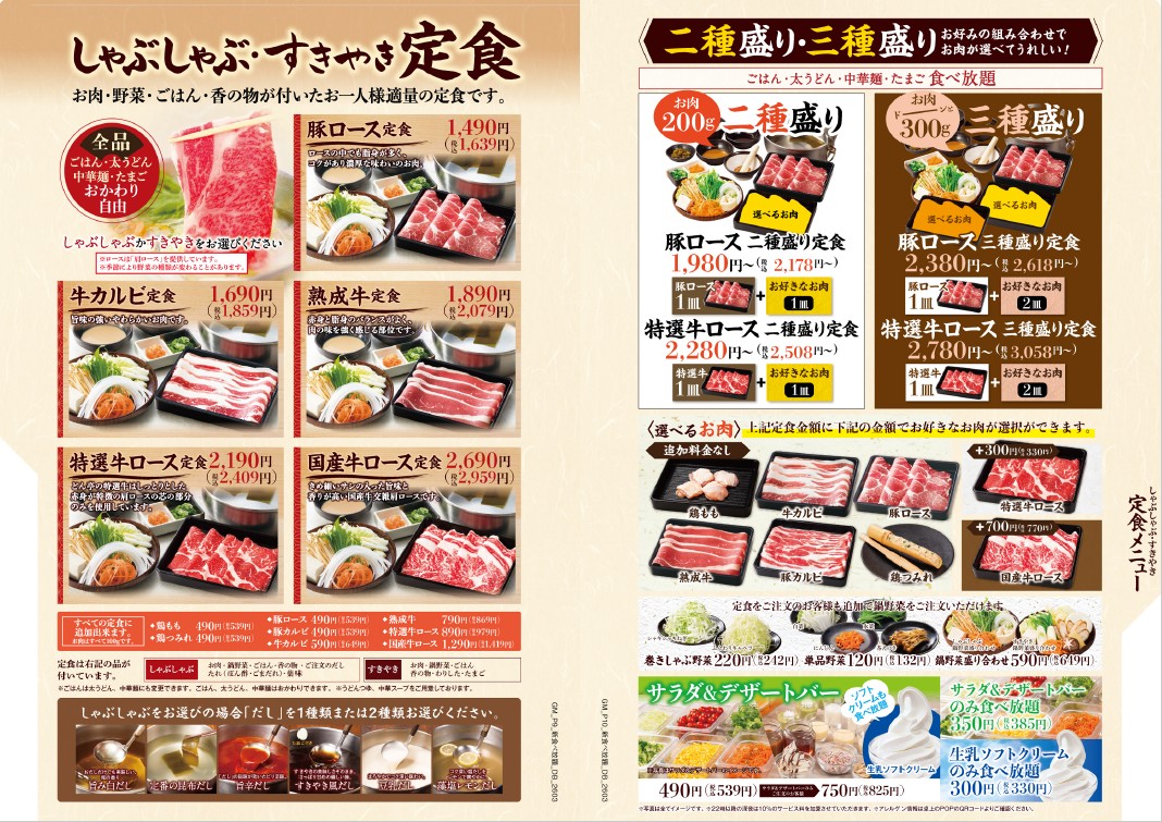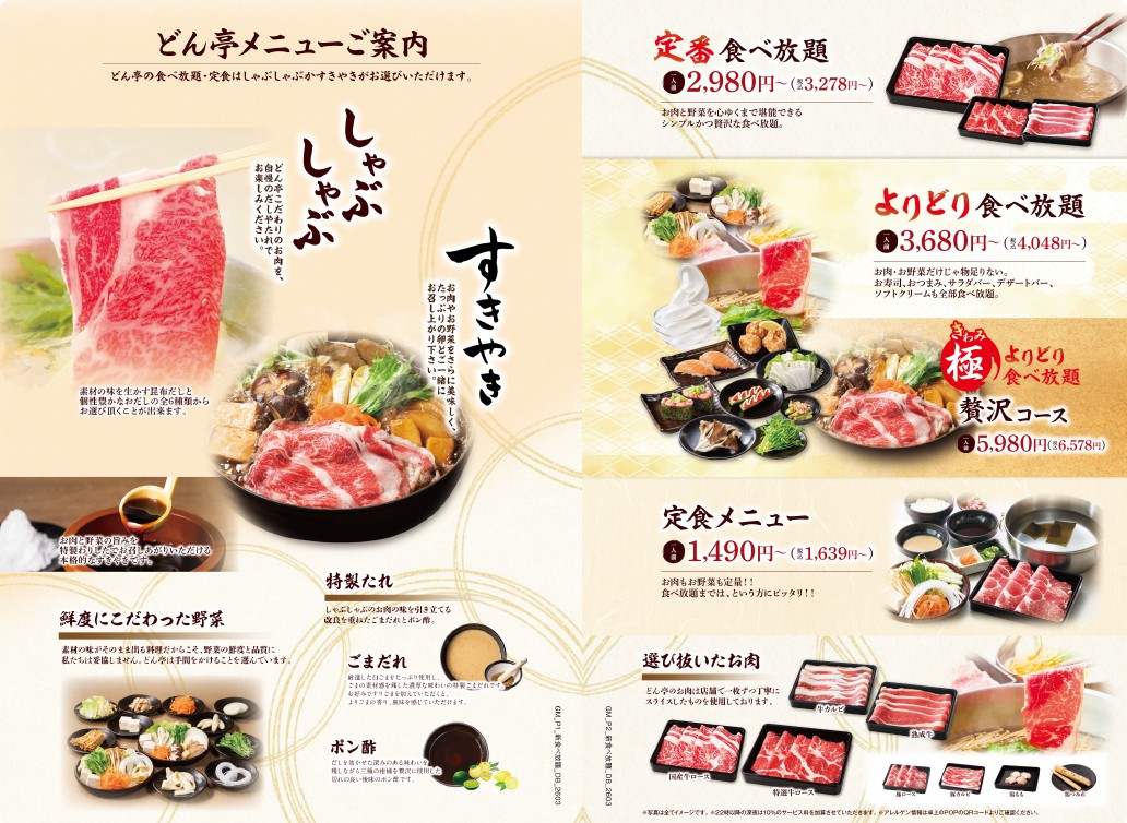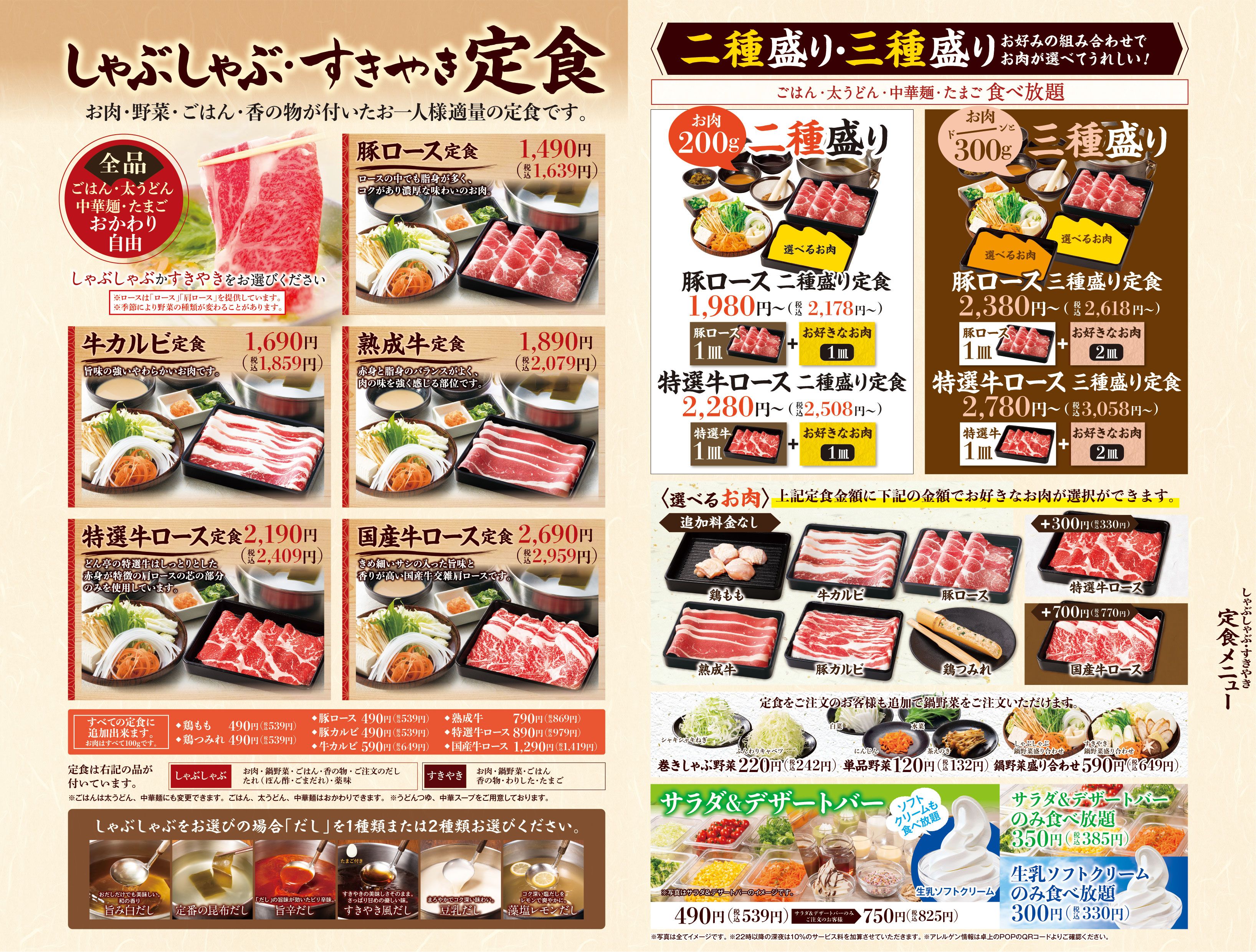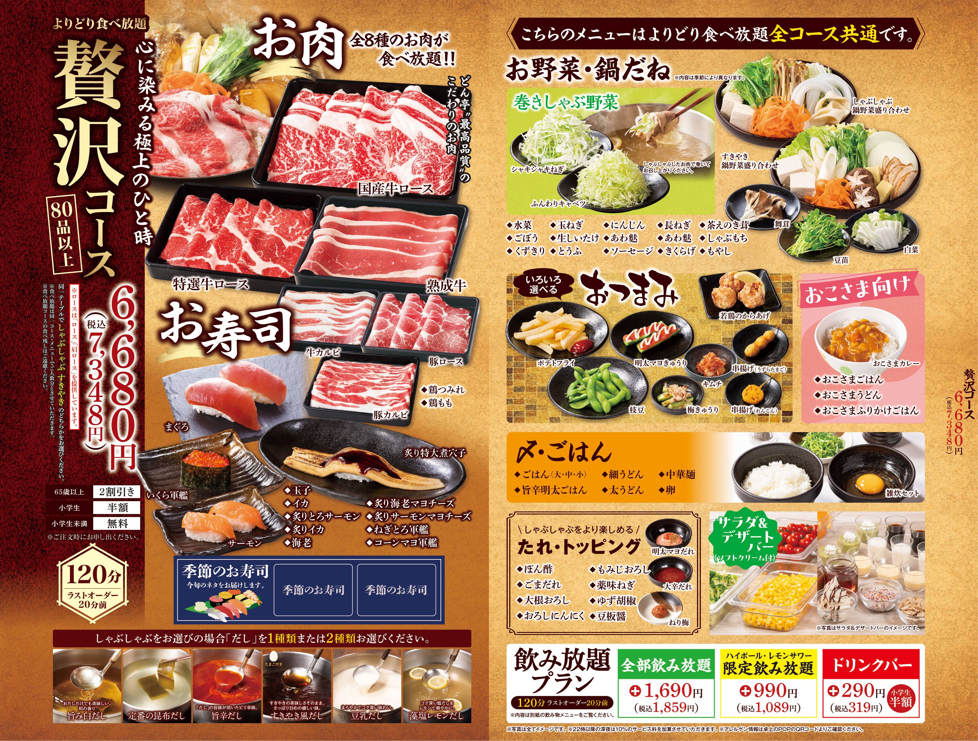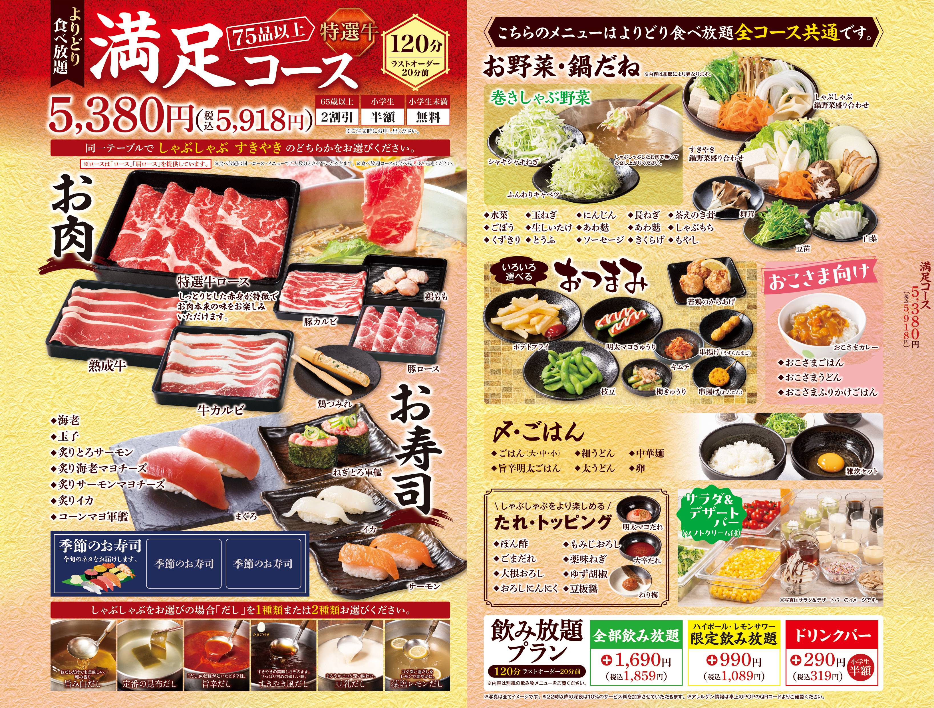 ※「しゃぶしゃぶ」か「すきやき」をお選びください。 ※食べ放題コースの制限時間は120分。※ラストオーダーは30分前とさせていただきます。 ※詳しいアレルゲン情報は、各商品の詳細をご確認ください。 ※22時以降にご注文のお客様には、深夜料金として10%のサービス料金を加算させていただきます。